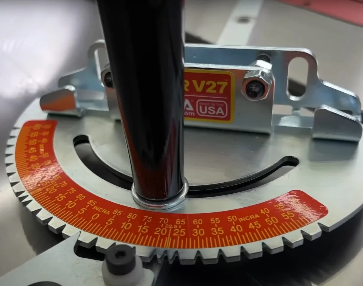 I like the V27 because it has positive stops in 5-degree increments with an extra stop at 22.5-degrees. It’s very easy to adjust. You just loosen the knob on the latch then turn the gauge to the degree cut you want. Most of us are cutting at 90 and 45-degrees, the most common cuts. I’ve had zero issues with this. When I lock it in, it stays at 90. It’s snug in the miter slot, and I can attach a faux fence to the front of it if I need some extra support. It’s well made, it’s extremely accurate, and it’s affordable, which I like.
