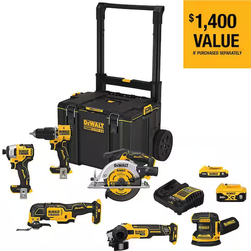 This DEWALT 20-Volt MAX Brushless 6-tool combo kit includes one 1/2 in. hammer drill/driver, 1/4 in. impact driver, oscillating multi-tool, 6-1/2 in. circular saw, XR 4-1/2 in. grinder, XR 5 in. random orbital sander , one 20-Volt MAX 5.0 Ah battery, one 20-Volt MAX 2.0 Ah compact battery, charger, and TOUGHSYSTEM 2.0 storage box. The DCD799 ATOMIC hammer drill/driver gets up to 14% more power for a variety of drilling applications. The DCF809 ATOMIC is equipped with a high-power transmission to deliver 1.700 in-lbs. of torque. The DCW210 XR Random orbital sander has variable-speed dial provides ultimate speed control from 8,000 OPM to 12,000 OPM for a variety of sanding applications. The DCS354 ATOMIC oscillating multi-tool had a dual-grip variable speed trigger to provide additional speed control during your applications. For added safety the DCS566 circular saw is equipped with an electric brake that quickly stops the blade after the trigger is released. The DCG405 XR grinders Power Loss Reset prevents accidental restarts following a power disruption when the tool is left in the "on" position.