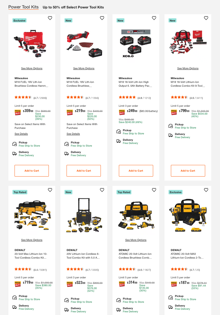 Select power tool kits from top brands like Milwaukee, RYOBI, RIDGID, and DEWALT.
