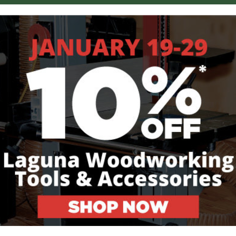 Woodcraft has 10% off Laguna and SuperMax Tools under January 29th.