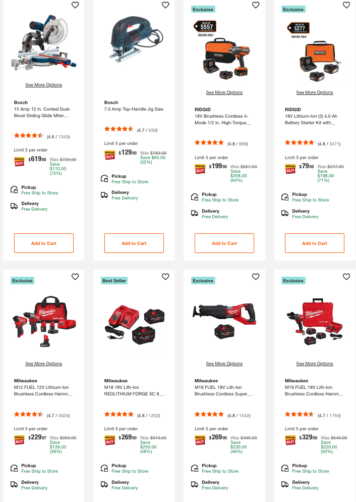 Combo kits and battery powered tool bundles often deliver the biggest percentage savings during storewide events. Accessory packs and add on items can also drop enough in price to make sense as cart fillers while you are already ordering.