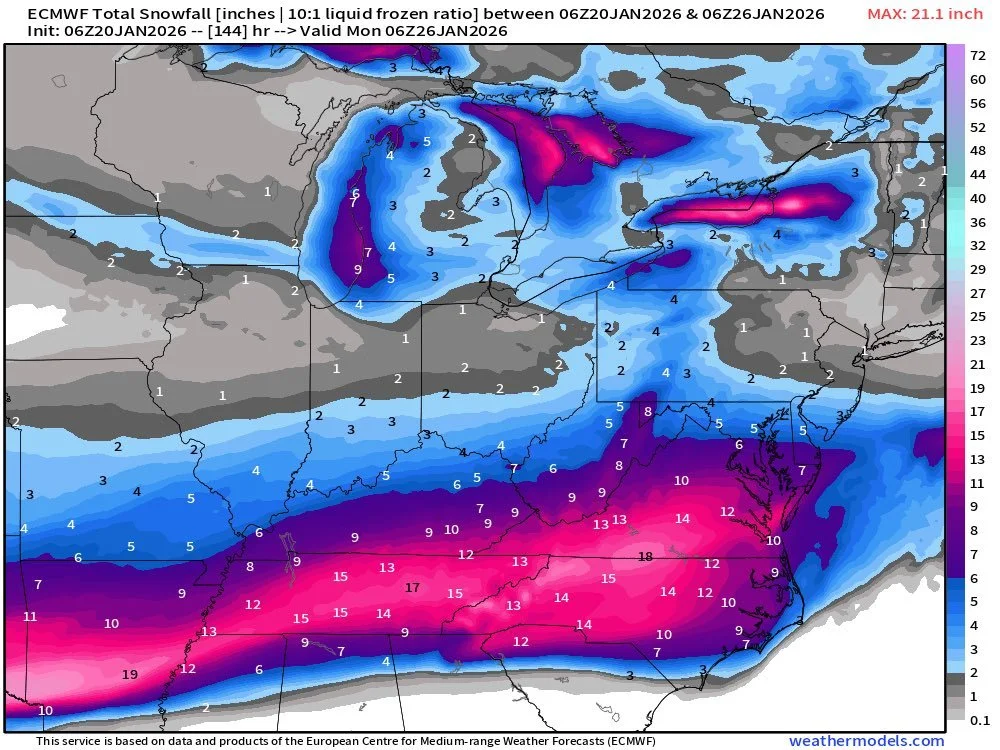 Multiple forecast models β Euro, Euro AI, and GFS β continue to show double-digit snowfall totals, something rarely seen with this level of consistency. Even ensemble means exceed 6 inches across large portions of the region.